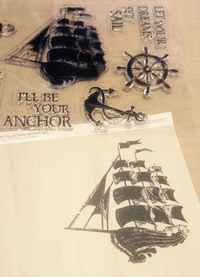 The stamp set 'On the Ocean' has that great image of a Sailing ship which I stamped in grey ink onto a pale patterned page from the 6x6" Paper Pad and fussy cut it out -